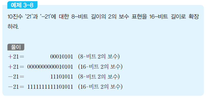 반면에, 2의 보수인 경우에는 확장되는 상위 비트들을 부호 비트와 같은 값으로 세트해야 된다. 즉, 양수의 경우에는 모든 상위 비트들을 0으로 세트하고, 음수의 경우에는 1로 세트한다. 이것을 부호-비트 확장이라고 부른다.