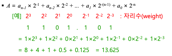 소수점의 바로 우측 비트는 2^-1, 그 다음 비트는 2^-2, ... 등의 자릿수(weight : 가중치)를 가진다.