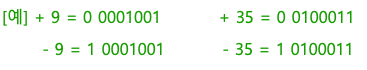 - 덧셈과 뺄셈을 수행하기 위해서는 부호 비트와 크기 부분을 별도로 처리해야 한다.