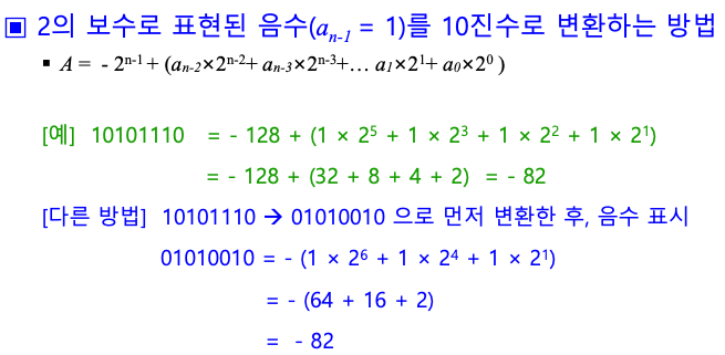 음수를 2진수로 표현하는 방법으로서, 1의 보수 및 2의 보수 표현이 있다.