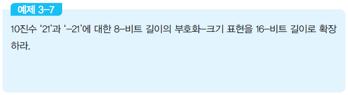ex) 기억장치에 8-비트 길이로 저장되어 있는 데이터를 읽어와서 16-비트 레지스터에 저장하는 경우에는, 읽어온 8-비트 데이터를 16비트 단어로 확장해야 한다. 부호화-크기 표현에서는 단순히 부호 비트를 새로운 맨 좌측으로 이동시키고, 그 외의 위치들은 0으로 채우면 된다.