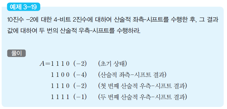 - 이 연산에서 중요한 것은 시프트 과정에서 부호 비트는 그대로 두고, 수의 크기를 나타내는 비트들만 시프트 시킨다는 점이다.