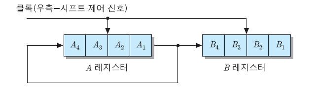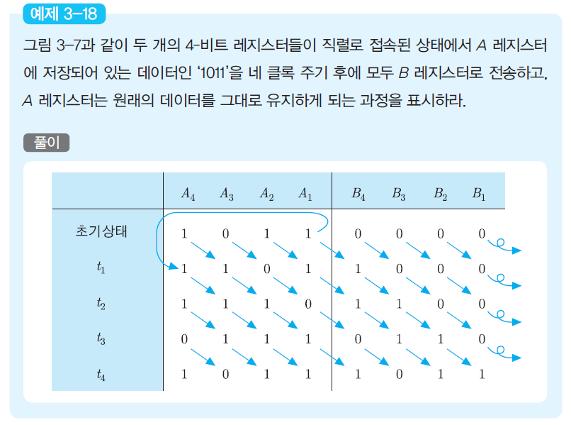 직렬 전송에서는 각 클록 주기마다 한 번씩의 시프트 연산이 일어난다. 따라서 4-비트 레지스터들 간의 직렬 전송을 위해서는 A 레지스터에서 네 번의 순환 시프트가 연속적으로 수행되고, B레지스터에서는 네 번의 논리적 시프트가 수행되어야 한다.