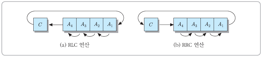 - 레지스터의 최상위 비트인 A4가 C 플래그로 들어가고 C 플래그의 원래 값은 레지스터의 최하위 비트(A1)로 이동한다. 우측으로 회전하는 RRC(rotate right with carry) 연산에서는 방향만 반대일 뿐 모든 동작은 좌측회전의 경우와 같다.